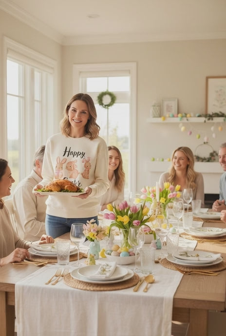 Soft, light, and gently cheerful — this crewneck brings a quiet Easter charm to everyday wear. Three watercolor bunnies, each with a tiny floral or bow accent, sit above a handwritten “Happy Easter” script, giving the sweatshirt a warm, handmade feel. The relaxed cut and lightweight cotton let it move with you on spring mornings: running after eggs in the yard, sipping coffee on the porch, or layering under a jacket for a family brunch. Subtle details like ribbed cuffs and neck tape keep the shape soft but tidy, so the piece stays comfortable and wearable long after the holiday passes. It reads like a little moment of spring you can carry on cool days.